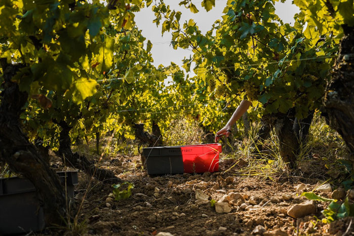 2018年、ファミーユ・パケはオーガニック栽培への転換からスタートしました。翌2019年からは、さらに一歩踏み込んでビオディナミ農法を導入。ボルドーの名門「ポンテ・カネ」で知られるジャン・ミシェル・コム氏をコンサルタントに迎え、ブドウ畑の可能性を最大限に引き出す試みが本格化しました。畑仕事の中でも、特に注力しているのが「剪定(せんてい)」のあり方です。従来のように葉を短く切りすぎると、かえって枝が余計に伸びてしまう。その結果、ブドウよりも葉の成長にエネルギーが使われてしまうのです。そこで、「あえて剪定を抑える」という選択をすることにより、太陽光からブドウを守りつつ、果実の凝縮感を高めることができるようになりました。すると不思議なことに、このアプローチをとった翌年から、ブドウの樹は前年の経験を記憶しているかのように、病気への耐性も強まっていきました。仕立てはギヨ・ドゥーブル方式。葉と果実のバランスを重視したこの方法が、テロワールの表現をいっそう豊かにしてくれます。