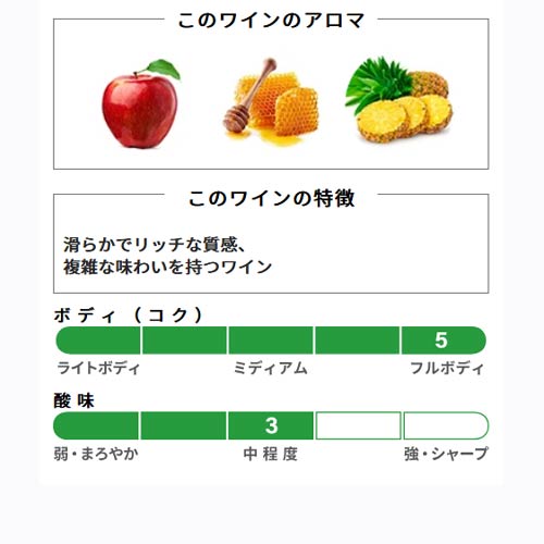 完熟したブドウは、オーク樽の中でゆっくりと熟成。グラスに注げば、淡い黄金色の輝き。熟した白桃やアカシアの花、蜂蜜、ブリオッシュの香りが広がり、口に含むと、ふくよかな果実味と洗練された酸、そしてミネラルの余韻が一体となり、静かな威厳を感じさせます。